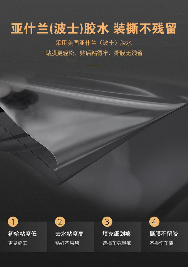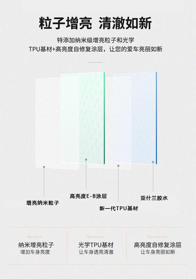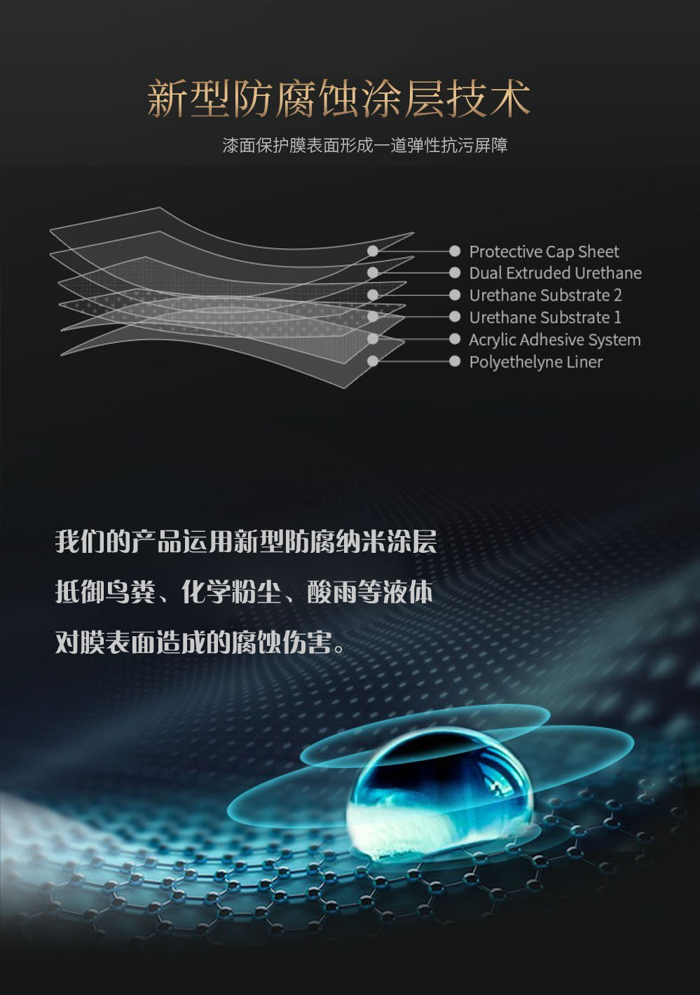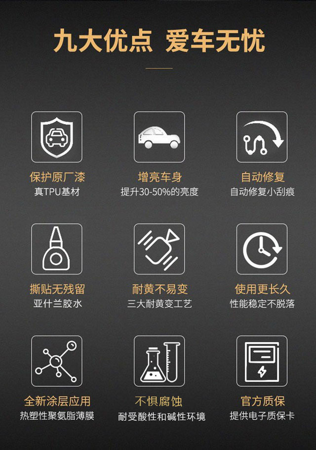 智创新材漆面保护膜经过不断创新,综合了目前漆面保护膜的特性,经过无数次的破坏性实验推出漆面保护膜新品系列,产品不仅具有优秀的抗污能力,而且划痕常温下快速自动修复,达到目前行业较高水平。智创新材漆面保护膜继续坚持创新、全力以赴保证一如既往的卓越品质,为客户提供一 流的产品和服务!